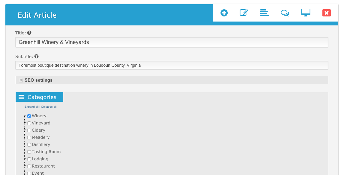 Tags: Add tags, the first tag should always be the name of your winery (same as Title). Then use the “add existing” tags drop down menu to add others that are relevant. It’s up to you. We’ll monitor this also and add some we think are best. Tags help the system relate other wineries or articles in the Related Articles section below your profile and help visitors search for your winery.